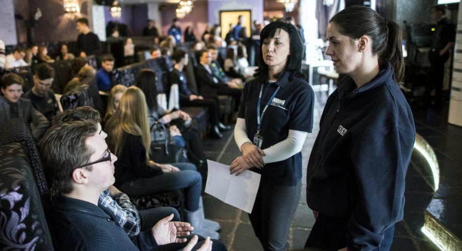 Staff members of the OSCE Special Monitoring Mission to Ukraine discussing with students during an OSCE Café in Luhansk, 16 February 2018.