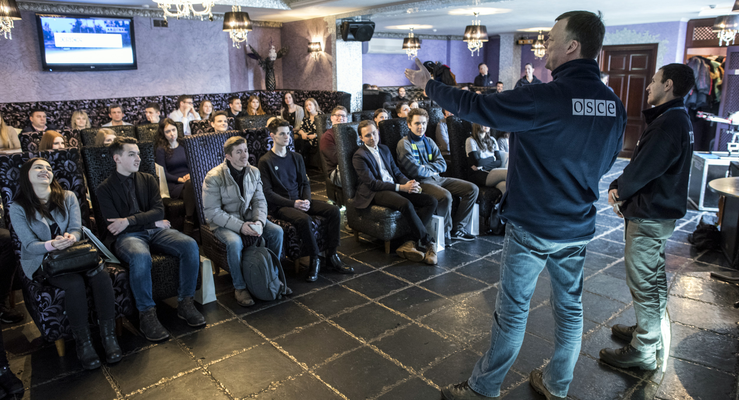 OSCE SMM Principal Deputy Chief Monitor Alexander Hug talking to the participants at the OSCE Café in Luhansk, 16 February 2018.