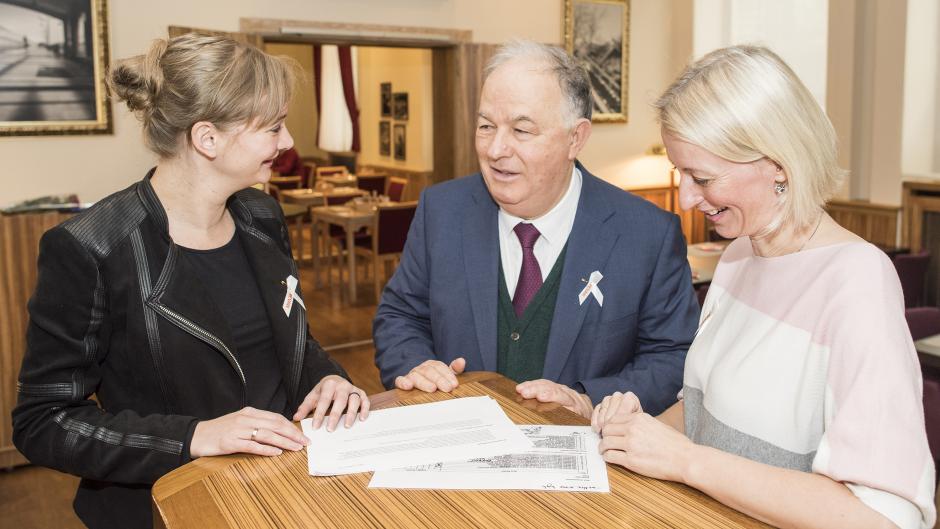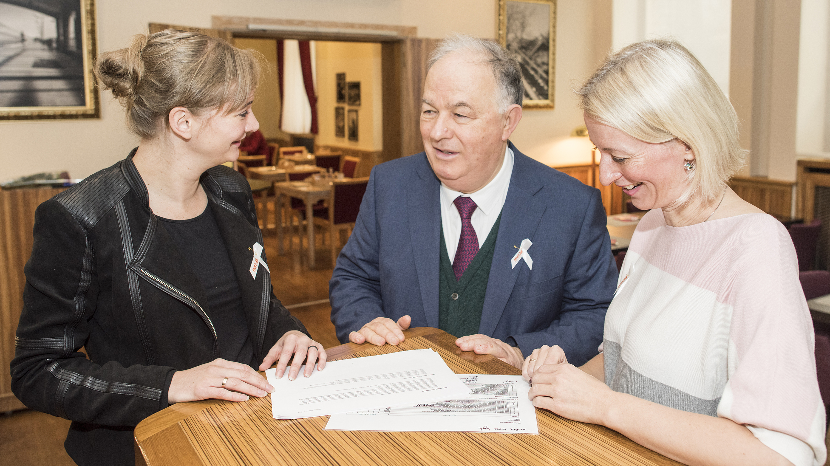 OSCE SMM Chief Monitor Ertugrul Apakan (c) in discussion with Liliya Grudko (r), OSCE PCU Programme Manager Human Security, and Yvette Langenhuizen (l), OSCE SMM Senior Gender Adviser, Kyiv, 20 November 2018.