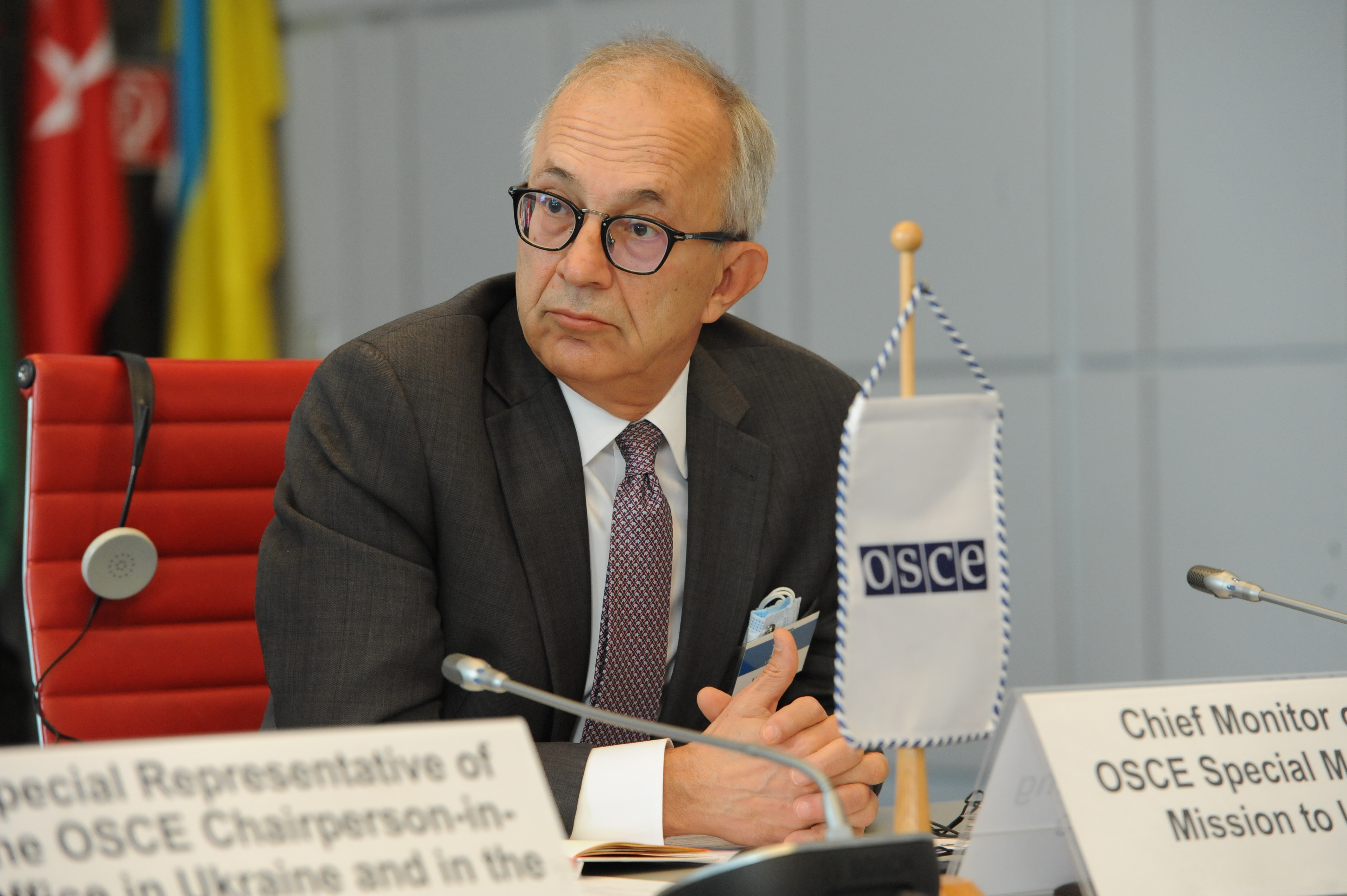 Yaşar Halit Çevik, Chief Monitor of the OSCE Special Monitoring Mission to Ukraine, addresses the OSCE Permanent Council, Vienna, 8 October 2020. (OSCE/Micky Kroell)