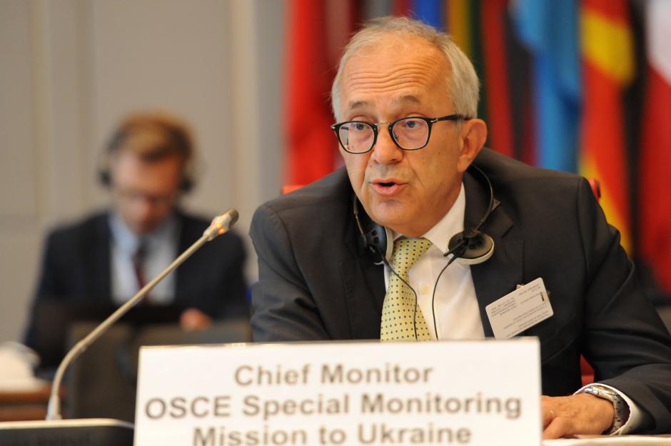 Yaşar Halit Çevik, Chief Monitor of the OSCE Special Monitoring Mission to Ukraine, addresses the OSCE Permanent Council, Vienna, 8 July 2021. (OSCE/Micky Kroell)
