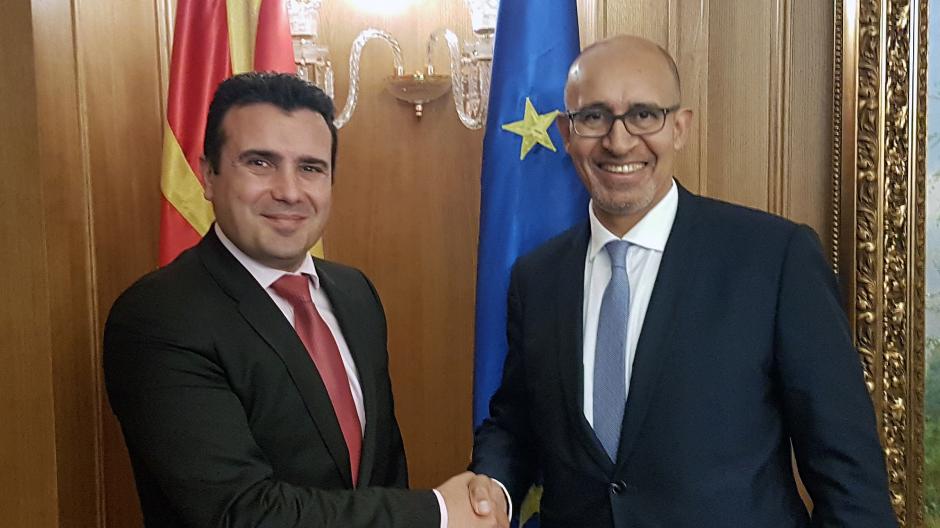Zoran Zaev, Kryeministër, dhe Harlem Désir, Përfaqësues për Lirinë e Medias, gjatë vizitës së tij në Shkup më 15 nëntor, 2017.
