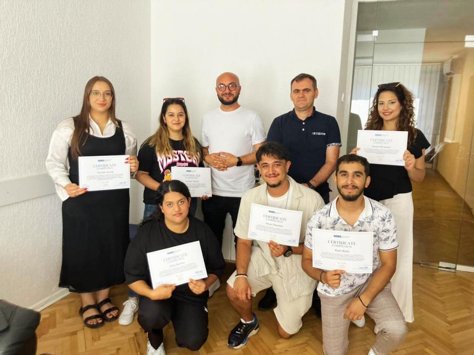 Alisani (në mes) me praktikantët e tjerë pas përfundimit të programit të praktikës së Misionit të OSBE-së në institucionet publike, gusht 2024.