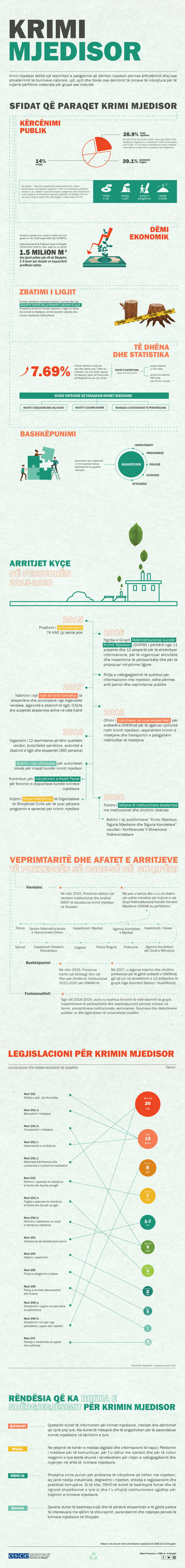 Që nga viti 2015, Prezenca e OSBE-së në Shqipëri ka ndihmuar autoritetet vendase të kuptojnë më mirë krimet mjedisore, ka mbështetur krijimin e kapaciteteve të autoriteteve të krijuara në bazë të ligjit dhe jo vetëm, si dhe zhvillimin e mjeteve teknike dhe ndërgjegjësuese për parandalimin, luftimin dhe ndjekjen ligjore të këtyre krimeve. Informacionet në trajtë pamore ofrojnë tablonë e punës së Prezencës kundër krimit mjedisor për periudhën 2015-2020.