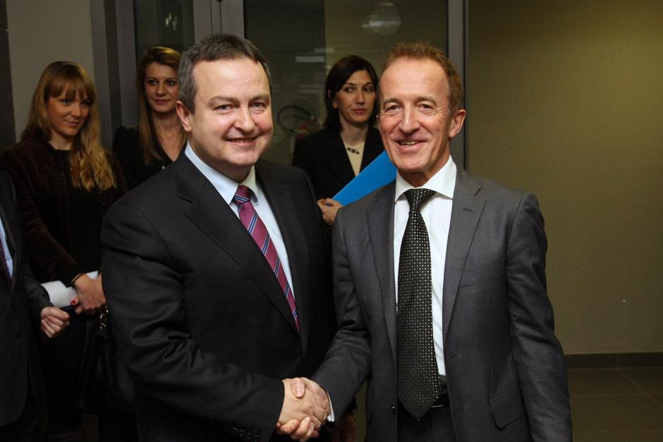 Predsedavajući OEBS-u, ministar spoljnih poslova Srbije Ivica Dačić i šef Misije OEBS u Srbiji ambasador Peter Burkhard obeležavaju početak posete predsedavajućeg misijama na terenu Organizacije, Beograd 29. januar 2014. god.