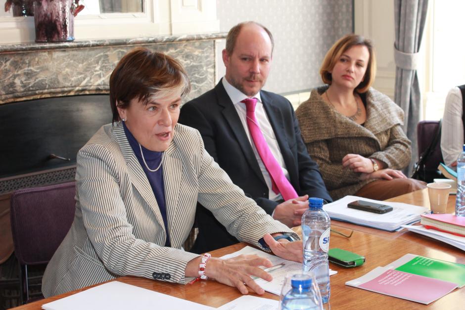 Visoka komesarka OEBS-a za pitanja nacionalnih manjina Astrid Tors razgovara o pitanjima u vezi sa obrazovanjem i integracijom nacionalnih manjina sa predstavnicima Vlade Republike Srbije, Misije OEBS-a u Srbiji i ostalih relevantnih institucija. Hag, 12. mart 2015. godine.
