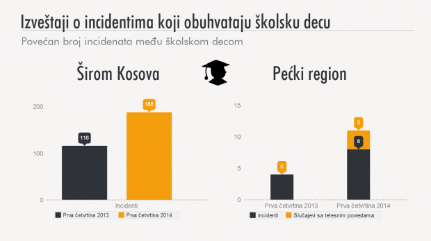 Prema njihovim podacima, policiji je 2013. godine u regionu Peći prijavljeno ukupno 45 incidenata u kojima su učestvovali učenici. Kada se uporede prvi kvartali 2013. i 2014. godine ova brojka se udvostručila, sa 4 na 8, uključujući tri slučaja sa telesnim povredama. Brojke su nažalost slične na celom Kosovu. U prvom kvartalu 2013. godine policiji je prijavljeno 116 slučajeva u kojima su učestvovali učenici. Ovaj broj se u istom periodu 2014. godine popeo na 188.