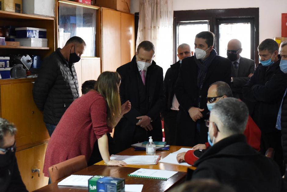 Predavač iz Udruženja slepih objašnjava Kilijanu Valu, vršiocu dužnosti šefa Misije OEBS-a na Kosovu, kako se glasa pomoću Brajevog pisma tokom njegove posete radionici o glasanju slepih i slabovidih, koju je podržala Misija. Priština, 11. februar 2021.