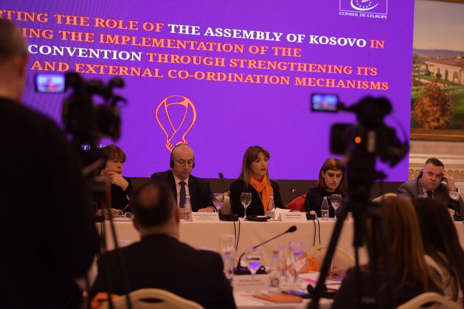 Govornici u uvodnom delu okruglog stola na visokom nivou, u organizaciji Misije OEBS-a na Kosovu, o ulozi Skupštine u praćenju primene „Istanbulske konvencije“ na Kosovu, Priština, 22. novembar 2023.