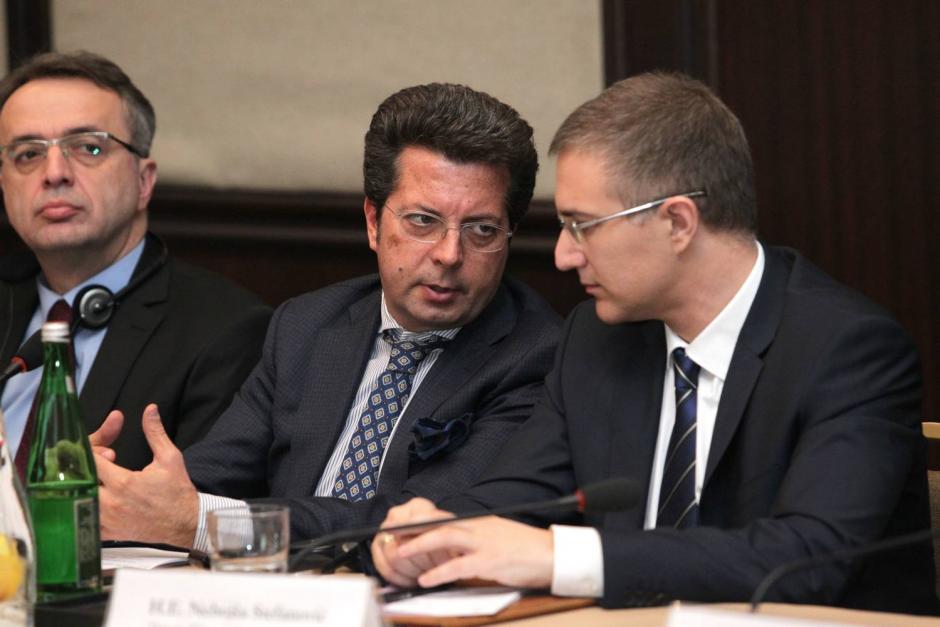 (l-d) Goran Danilović, ministar unutrašnjih poslova Crne Gore, šef Misije OEBS-a u Srbiji, ambasador Andrea Oricio i Nebojša Stefanović, ministar unutrašnjih poslova Srbije, na međunarodnoj konferenciji u Beogradu povodom predstavljanja dokumenta Regionalna procena pretnji od teškog i organizovanog kriminala. Beograd, 14. novembar 2016. godine.