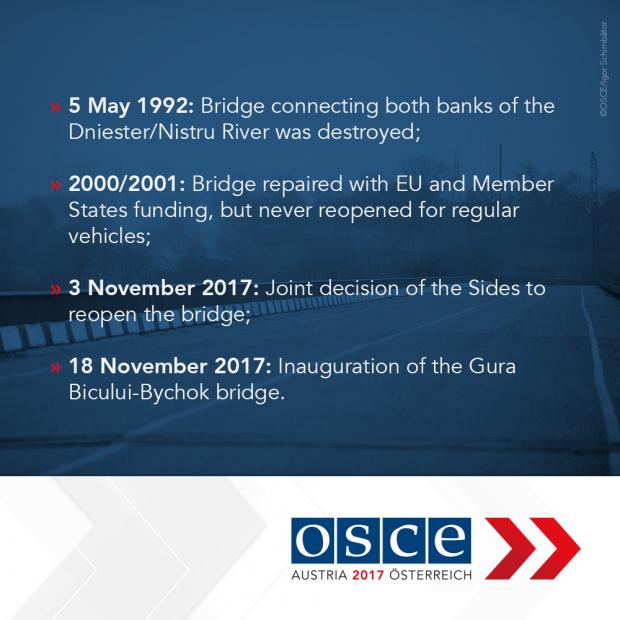 The Sides signed a ground-breaking decision on 3 November 2017 to reopen the Gura Bicului-Bychok bridge, which connects both banks of the Dniester/Nistru River and has not been in operation since the 1992 conflict.
