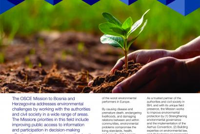 The OSCE Mission to Bosnia and Herzegovina addresses environmental challenges by working with the authorities and civil society in a wide range of areas. The Mission’s priorities in this field include improving public access to information and participation in decision-making affecting the environment, strengthening the capacities of the BiH Aarhus Centres and other relevant CSOs, and training justice sector professionals and future lawyers on environmental law. The Mission also supports local-level efforts that strengthen inter-municipal co-operation and directly involve citizens in protecting the environment.