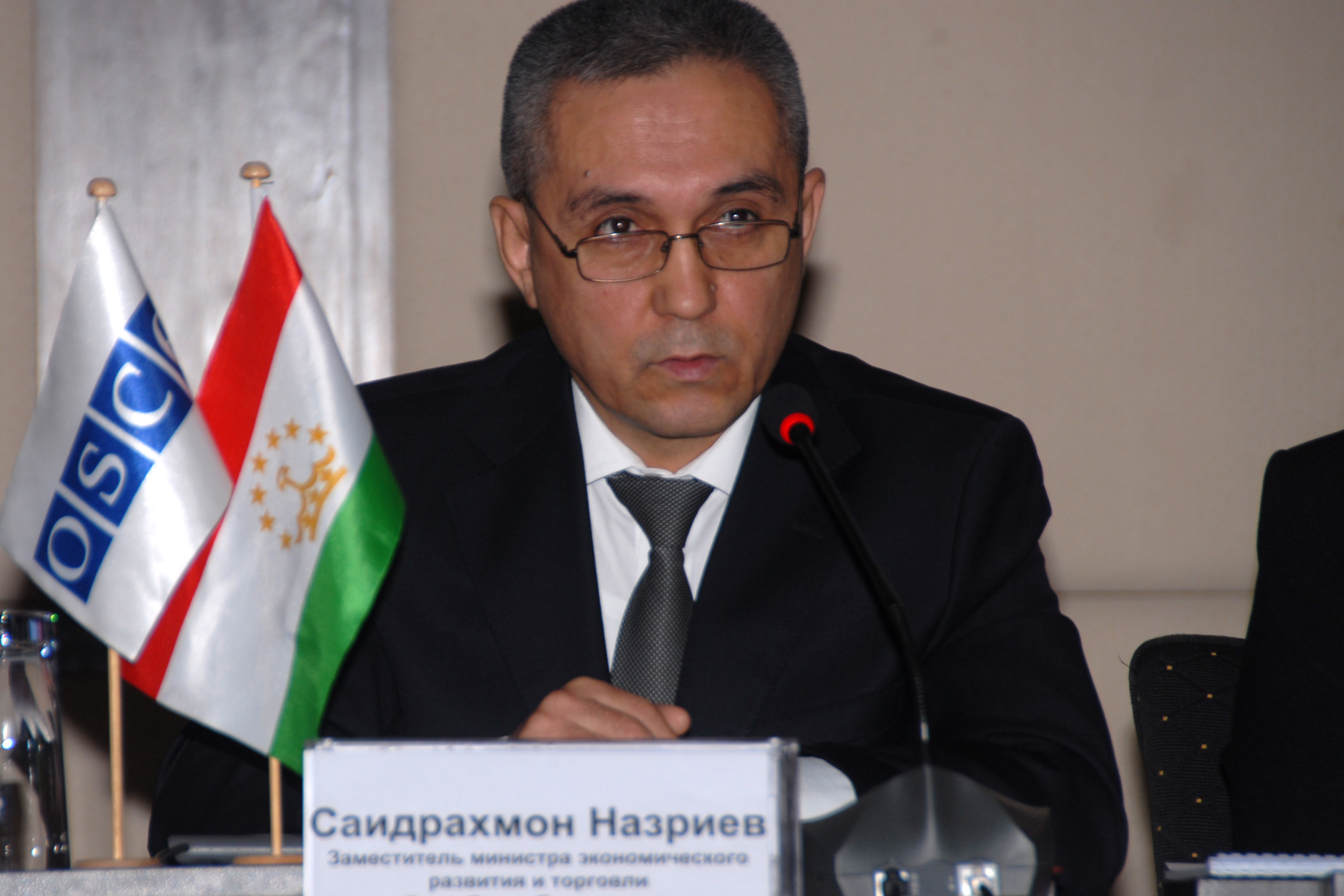 Saidrahmon Nazriev, Deputy Minister of Economic Development and Trade of Tajikistan, speaking at an OSCE-supported conference on Tajikistan’s World Trade Organization’s (WTO) commitments in the field of telecommunications and broadcasting services, Dushanbe, 19 March 2014.