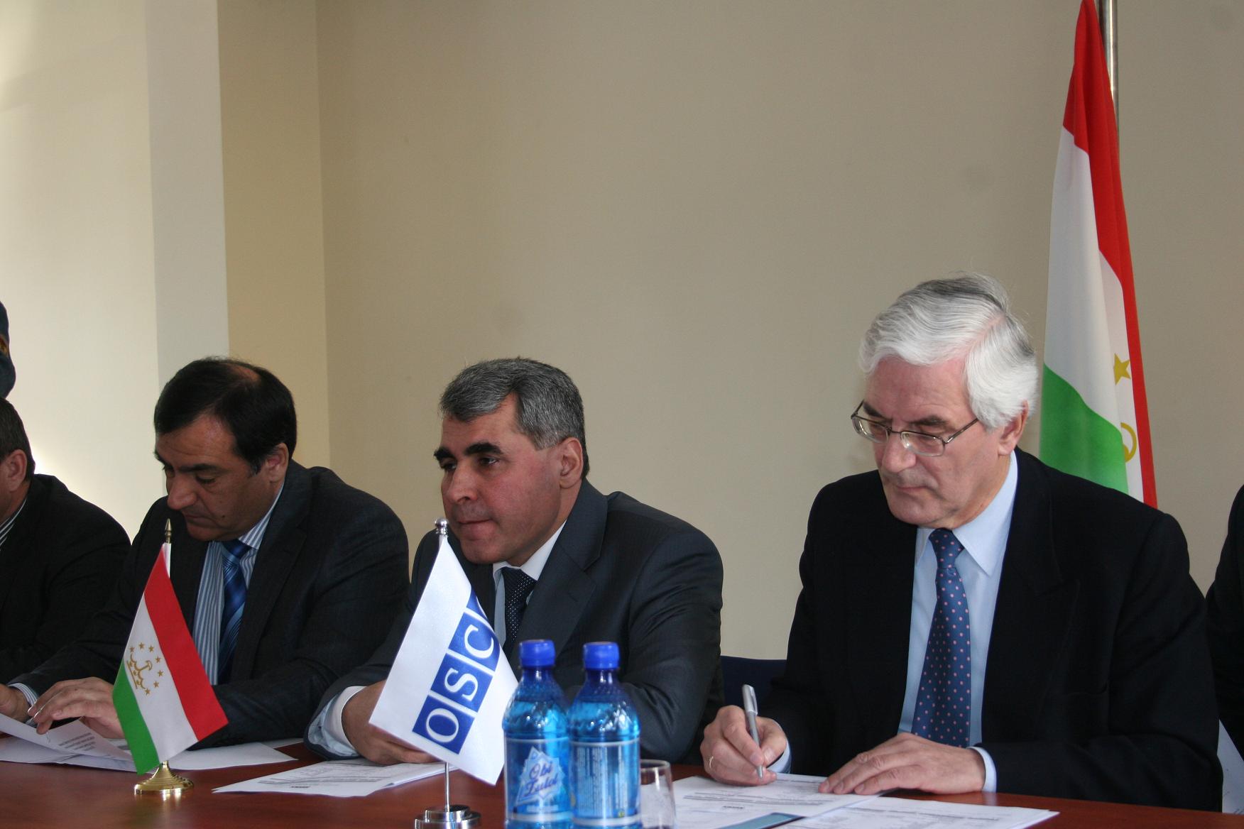 R-l: Amb. Ivar Vikki, Head of the OSCE Office in Tajikistan; Gen. Sharif Nazarov, Deputy Internal Affairs Minister; and Gen. Rustam Nazarov, Director of the Tajik Drug Control Agency at an OSCE-supported counter-narcotics course, Dushanbe, 17 Feb 2010.