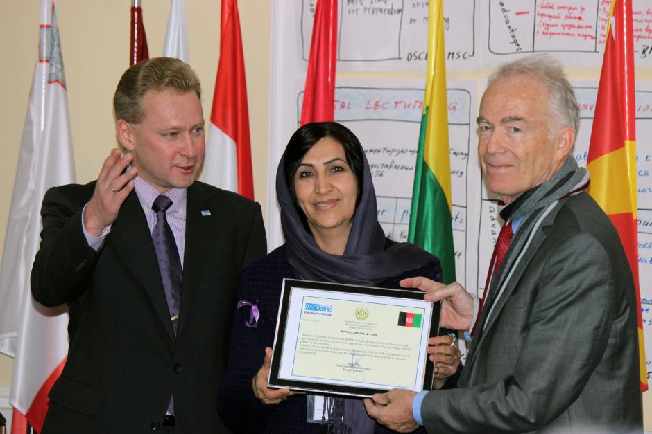 Manager at the Department of Research and Studies, Ministry of Counter Narcotics of Afghanistan Iran Gul Saihoon (c) hands over a letter of appreciation to the Head of OSCE Office in Tajikistan Ambassador Markus Mueller (r) and Chief of Education at the OSCE Border Management Staff College Alexander Eliseev (l), Dushanbe, 31 October 2014.