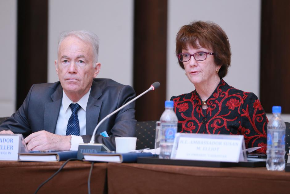 Ambassador Markus Mueller, Head of the OSCE Office in Tajikistan, and U.S. Ambassador to Tajikistan Susan M. Elliott speaking at a workshop on countering phenomenon of foreign terrorist fighters, Dushanbe, 24 February 2015.