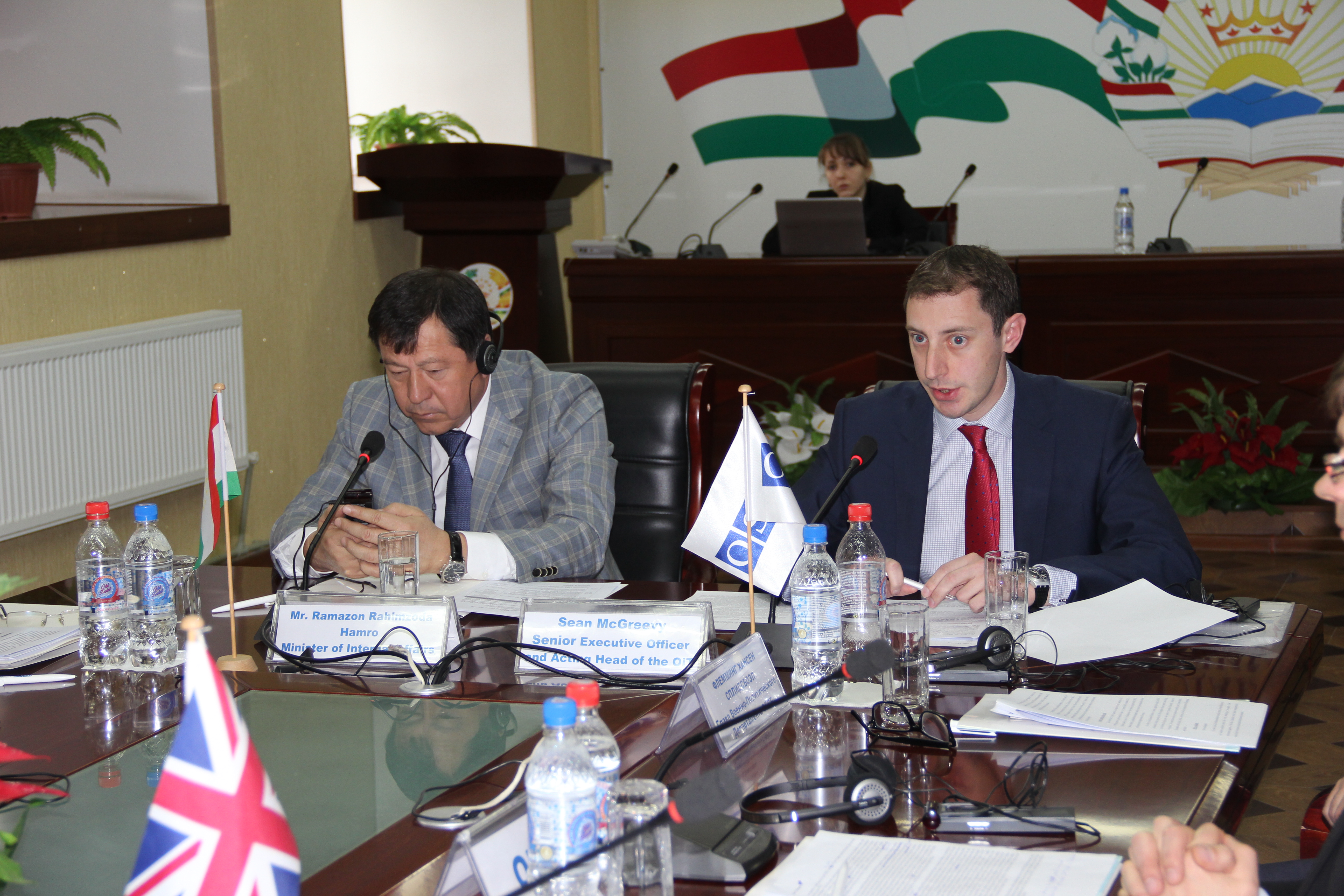 The Interior Minister of Tajikistan, Lieutenant General Rahimzoda Ramazoni Hamro (l), and Sean McGreevy (r), Senior Executive Officer at the OSCE Office in Tajikistan, speaking at police reform steering group meeting, Dushanbe, 27 March 2015.