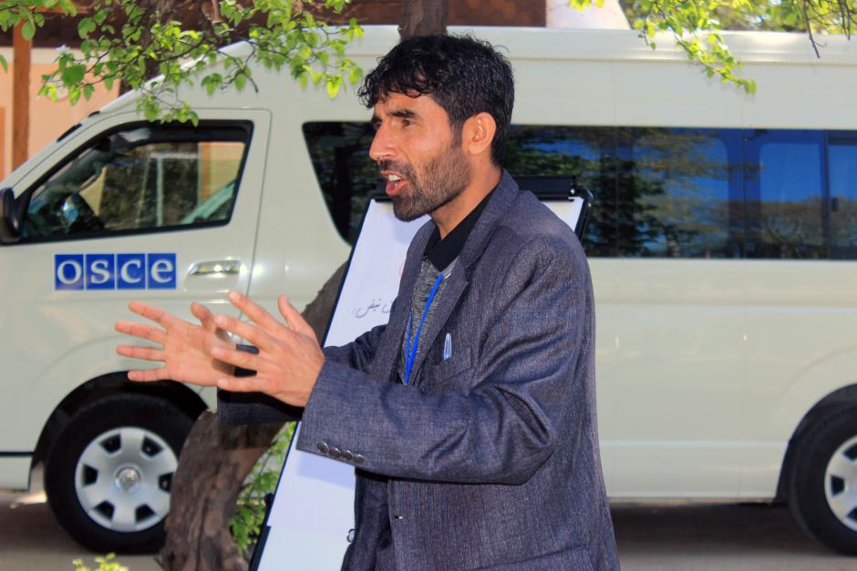 Bahrom Murodi, a trainer from the Afghan Border Police, delivers a study session based on the knowledge received during a train-the-trainer course, Dushanbe, 9 April 2015.