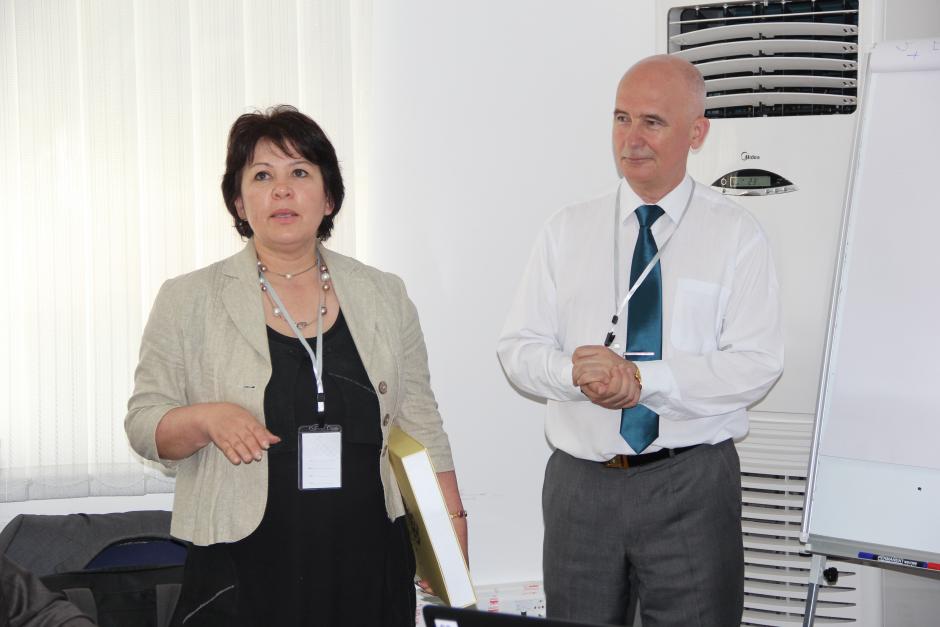 Expert from Lithuania Jan Baranovski and Alfiya Rafieva, a training participant from the Chamber of Commerce and Industry of the Republic of Tajikistan, during a graduation ceremony on simplifying and harmonising customs procedures, Dushanbe, 15 May 2015.