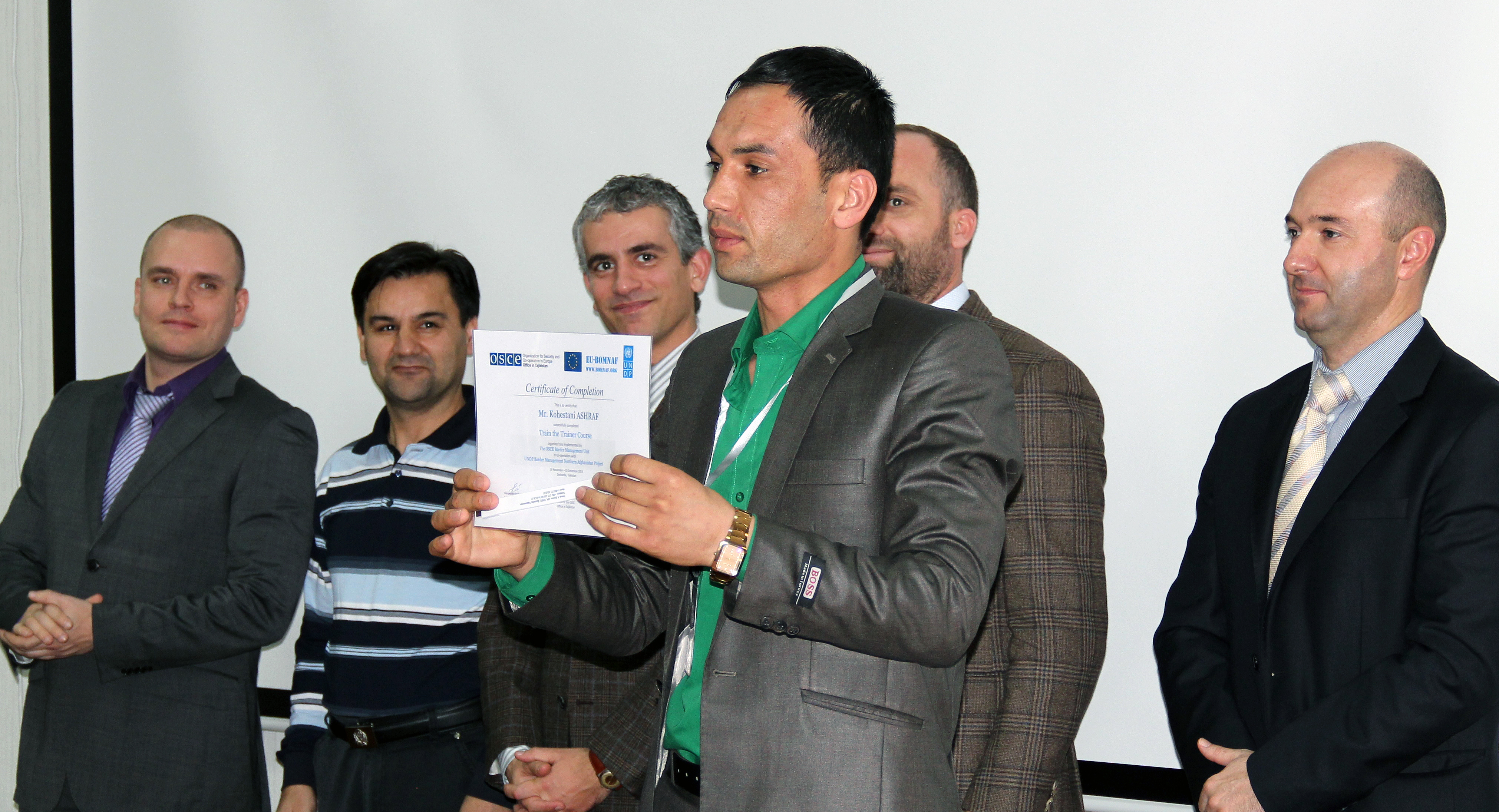 Kohestani Ashraf, the Afghan Border Police officer (c), holding a certificate at a graduation ceremony of the two-week train-the-trainer course for Afghan and Tajik border officers, Dushanbe, 2 December 2015.