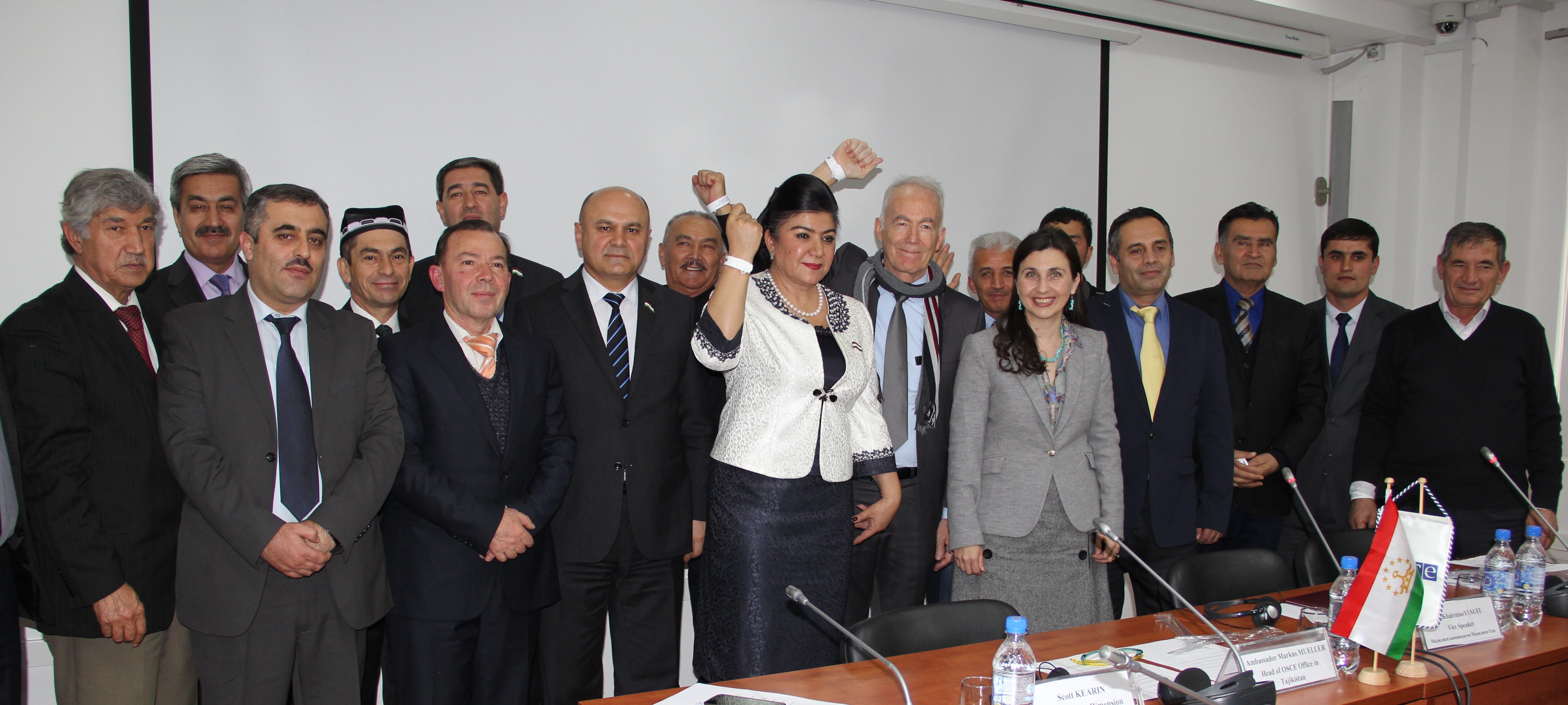 Hairiniso Yusufi, Vice Speaker of the lower house of Tajik Parliament (centre-left), Ambassador Markus Mueller, Head of the OSCE Office in Tajikistan (c), Vesna Ivanovikj-Castarede, Legal and Electoral Reform Officer of the OSCE Office in Tajikistan (centre-right), and prominent Tajik men raising up hands as a sign of their commitment to combat violence against women, Dushanbe, 10 December 2015.