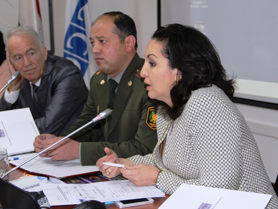 (L-r) Ambassador Markus Mueller, Head of the OSCE Office in Tajikistan, Makhmudzoda Ilkhomjon, Deputy Head of Prison Administration under the Ministry of Justice of Tajikistan and Vera Tkachenko, International Manager of the UNODC in Central Asia during a workshop on re-socialization of prisoners through income-generating activities, Dushanbe, 14 December 2015.