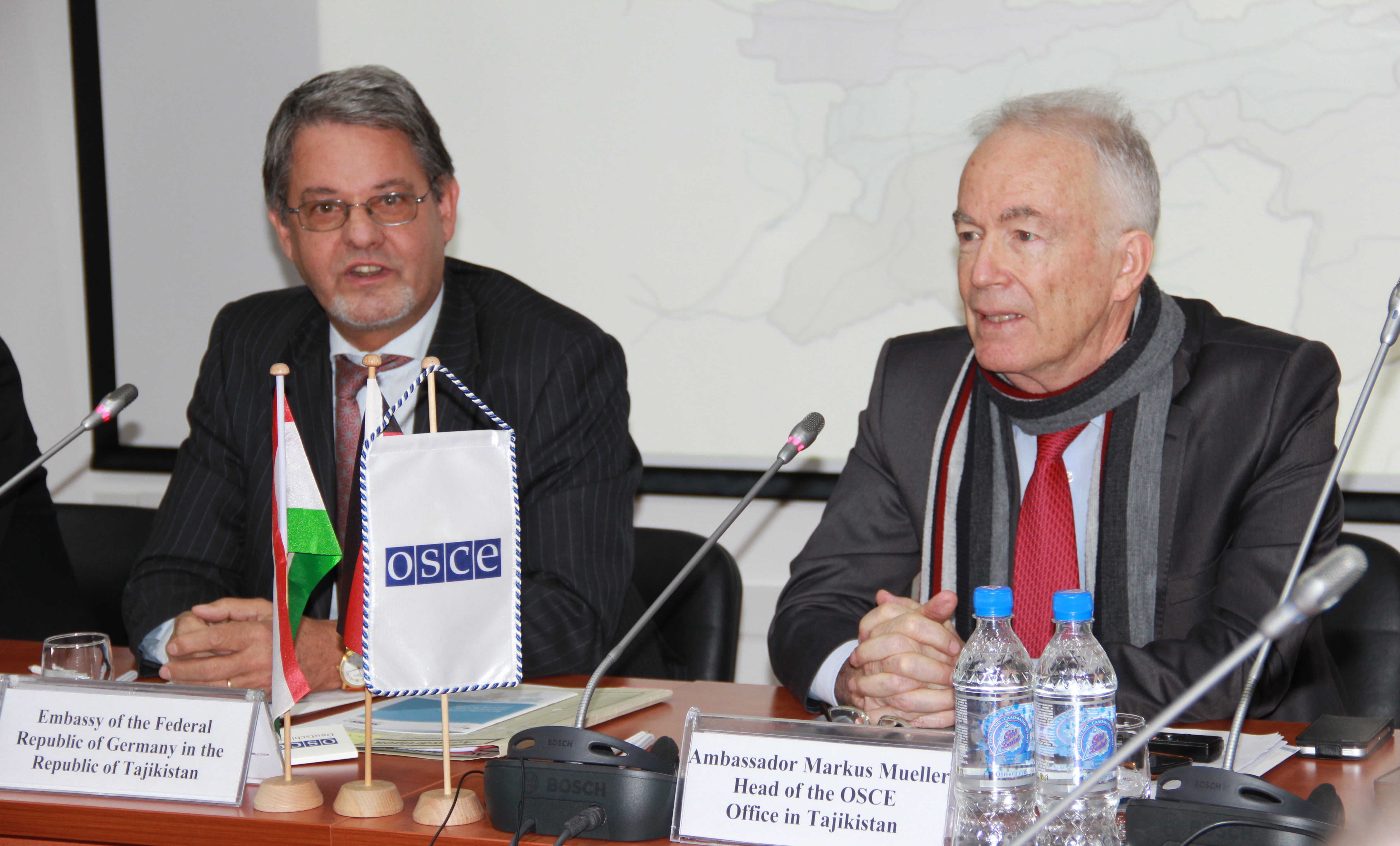 German Ambassador to Tajikistan Holger Green (l) and Ambassador Markus Mueller, Head of the OSCE Office in Tajikistan (r), discussing the priorities of 2016 German OSCE Chairmanship, Dushanbe, 10 February 2016.