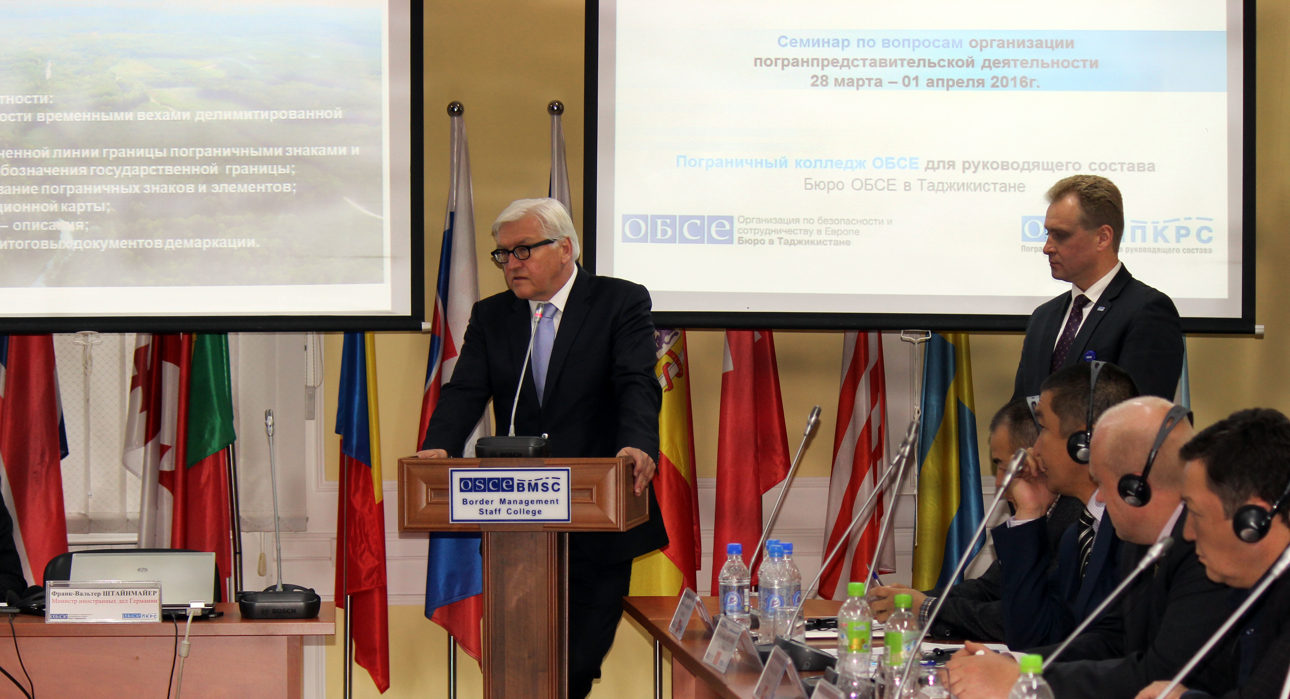 OSCE Chairperson-in-Office and Germany’s Foreign Minister Frank-Walter Steinmeier addresses border officials from Kyrgyzstan and Tajikistan participating in a course at the OSCE Office in Tajikistan’s Border Management Staff College. Dushanbe, 1 April 2016.