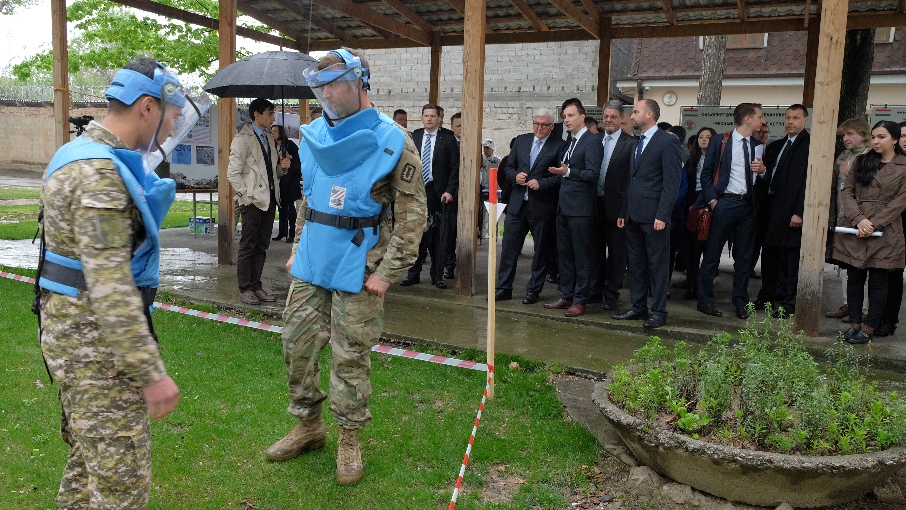 US ARCENT and Kyrgyz Ministry of Defence instructors showcasing the unexploded ordnance visual search procedure used during Battle Area Clearance operations, Dushanbe, 1 April 2016.