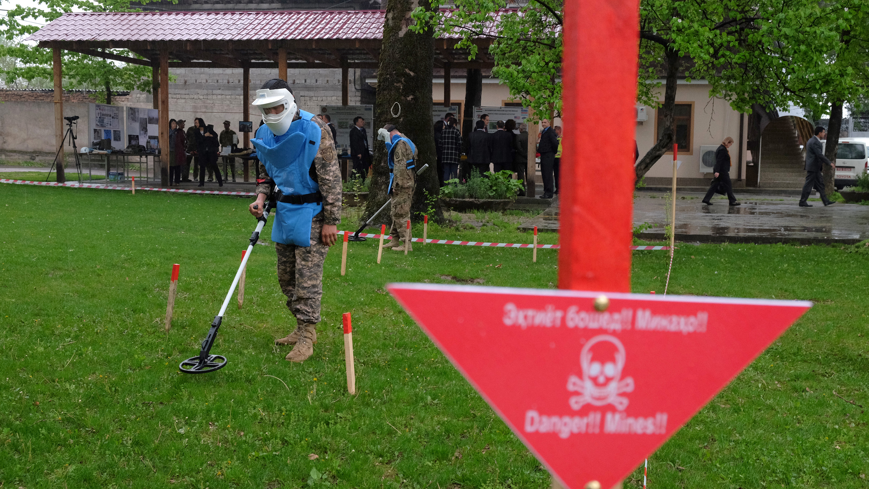 US ARCENT and Kazakh Ministry of Defence instructors demonstrating sub-surface clearance procedures using unexploded ordnance detectors, Dushanbe, 1 April 2016.
