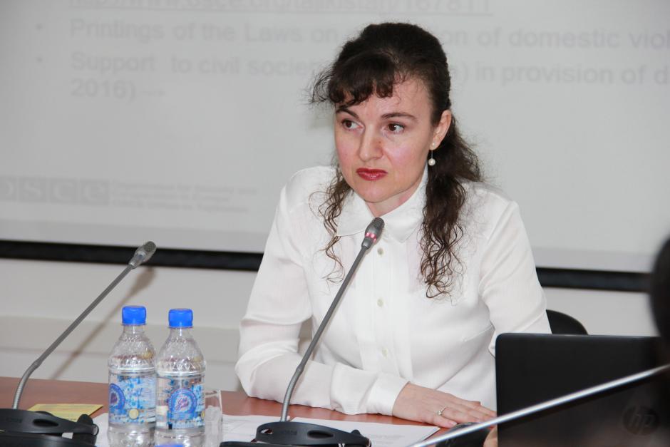 Viorelia Rusu, Gender and Anti-Trafficking Officer at the OSCE Office in Tajikistan, presenting the Office’s portfolio on gender equality, Dushanbe, 26 April 2016.