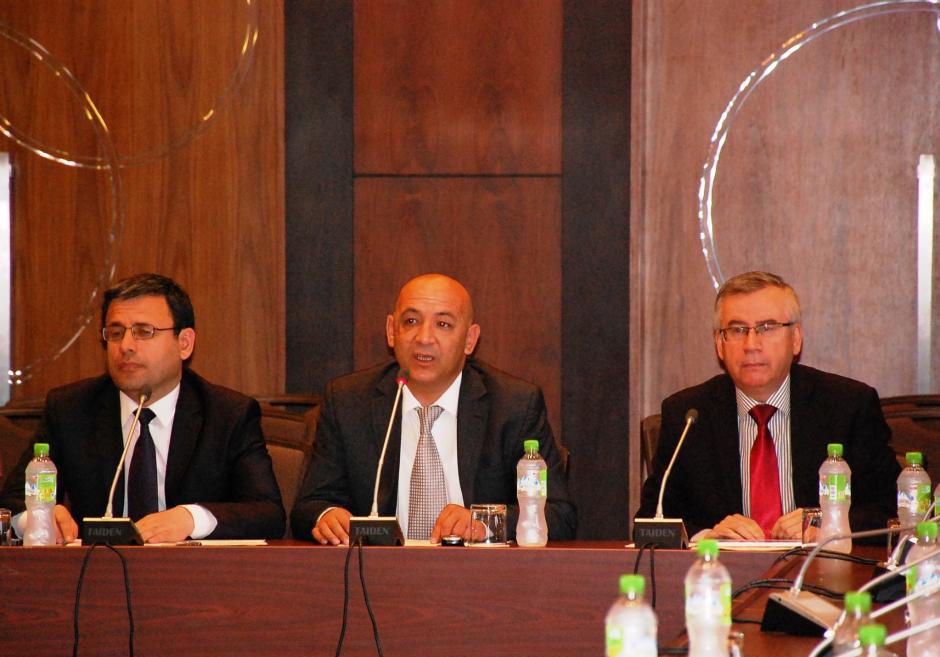 Chairman of Tajikistan Union of Journalists and Director of Media Academy of Tajikistan Zinatullo Ismoilzoda (l), Chairman of the Tajik Media Council Khurshed Niyozov (c), and Chairman of National Association of Independent Mass Media in Tajikistan, Nuriddin Karshiboev (r), during a World Press Freedom Day conference, Dushanbe, 3 May 2016.