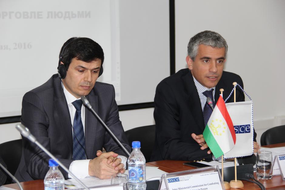 Jonibek Kholikzoda, Secretary of Inter-Ministerial Commission for Combating Trafficking in Persons (l) and Fabio Piana, Deputy Head of the OSCE Office in Tajikistan (r), speaking at a high-level dialogue on countering trafficking in human beings, Dushanbe, 24 May 2016.