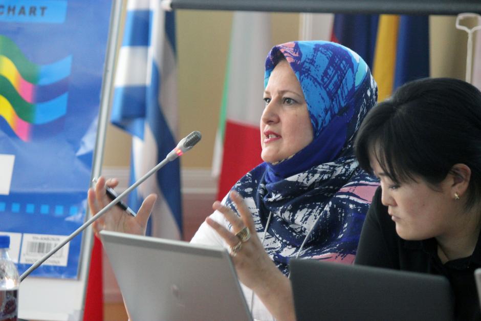 Hafida Abebsi from Algeria presenting the results of group research works on the effects of the transnational crime, peace and security at the OSCE Border Management Staff College,Dushanbe, 26 May 2016.