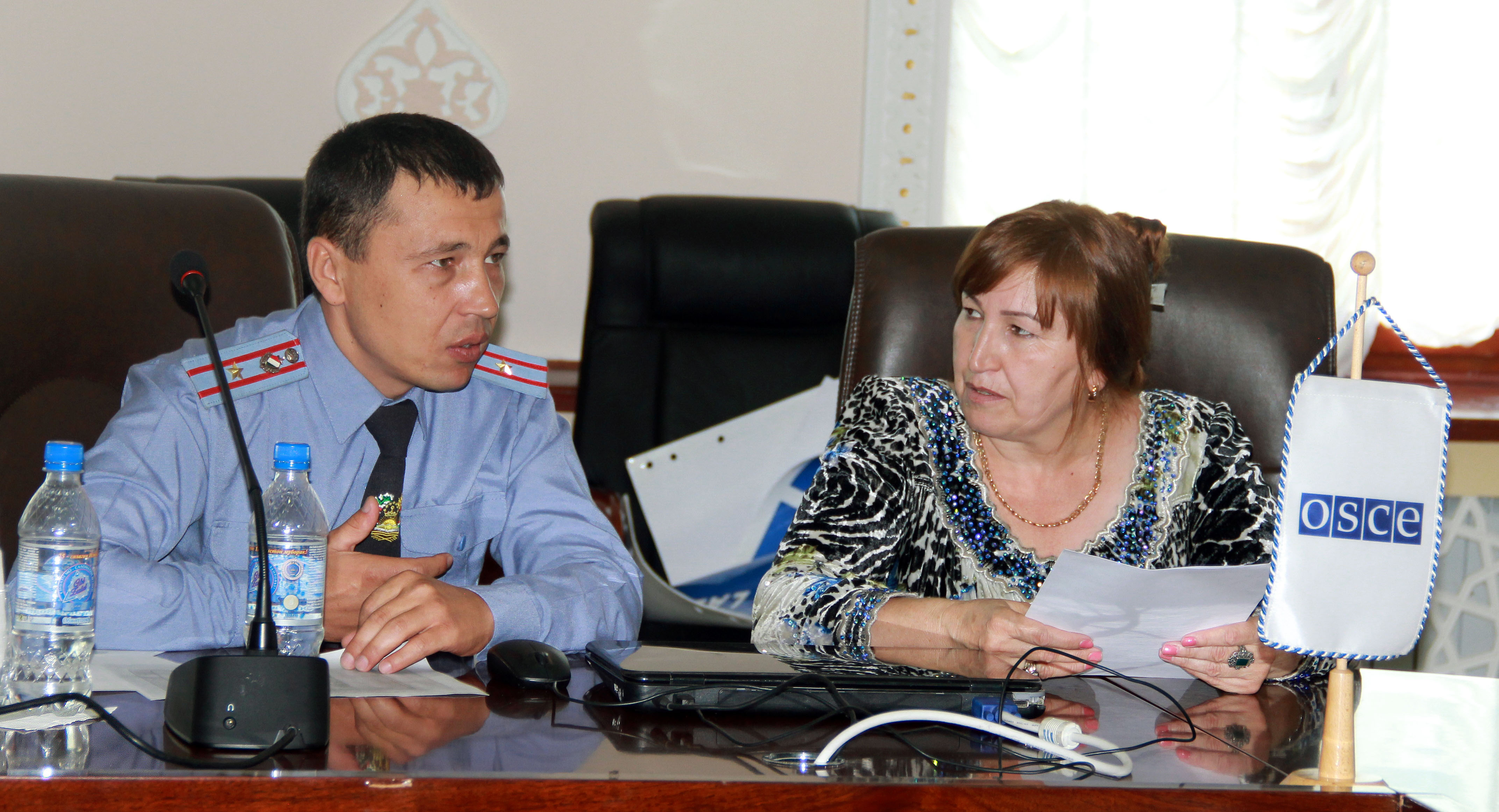 (l-r) Mr.Soliev Sobirjon, Gender Sensitive Police Unit Police Officer and Ms. Gulchehra Hasanova, Manager of Women Resource Centre "Kuhsor" during a workshop on improving the local referral mechanisms for the protection of domestic violence victims, Khujand, 13 July 2016.