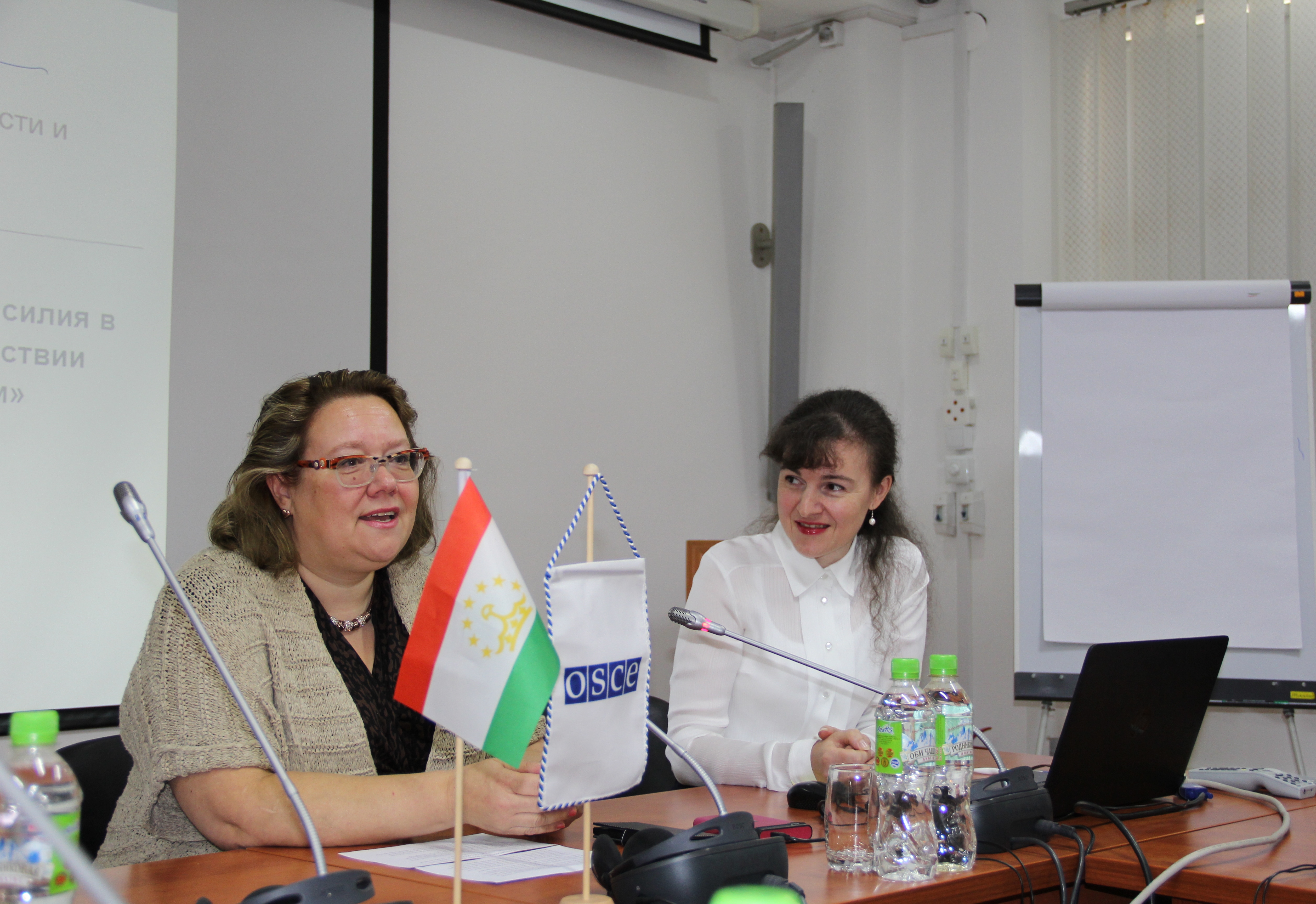 Ambassador Tuula Yrjölä, Head of the OSCE Office in Tajikistan (l) and Viorelia Rusu, the OSCE Office’s Gender and Anti-Trafficking Officer (r), speaking at a training course on rehabilitation techniques for domestic violence survivors, Dushanbe.