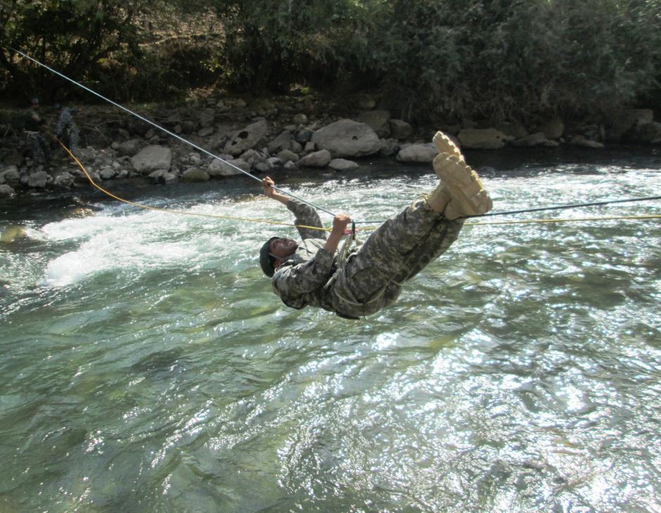 Afghan border police officer conducts river crossing at Karatag during a patrol leadership course, Gissar, Tajikistan, 25 May 2016.
