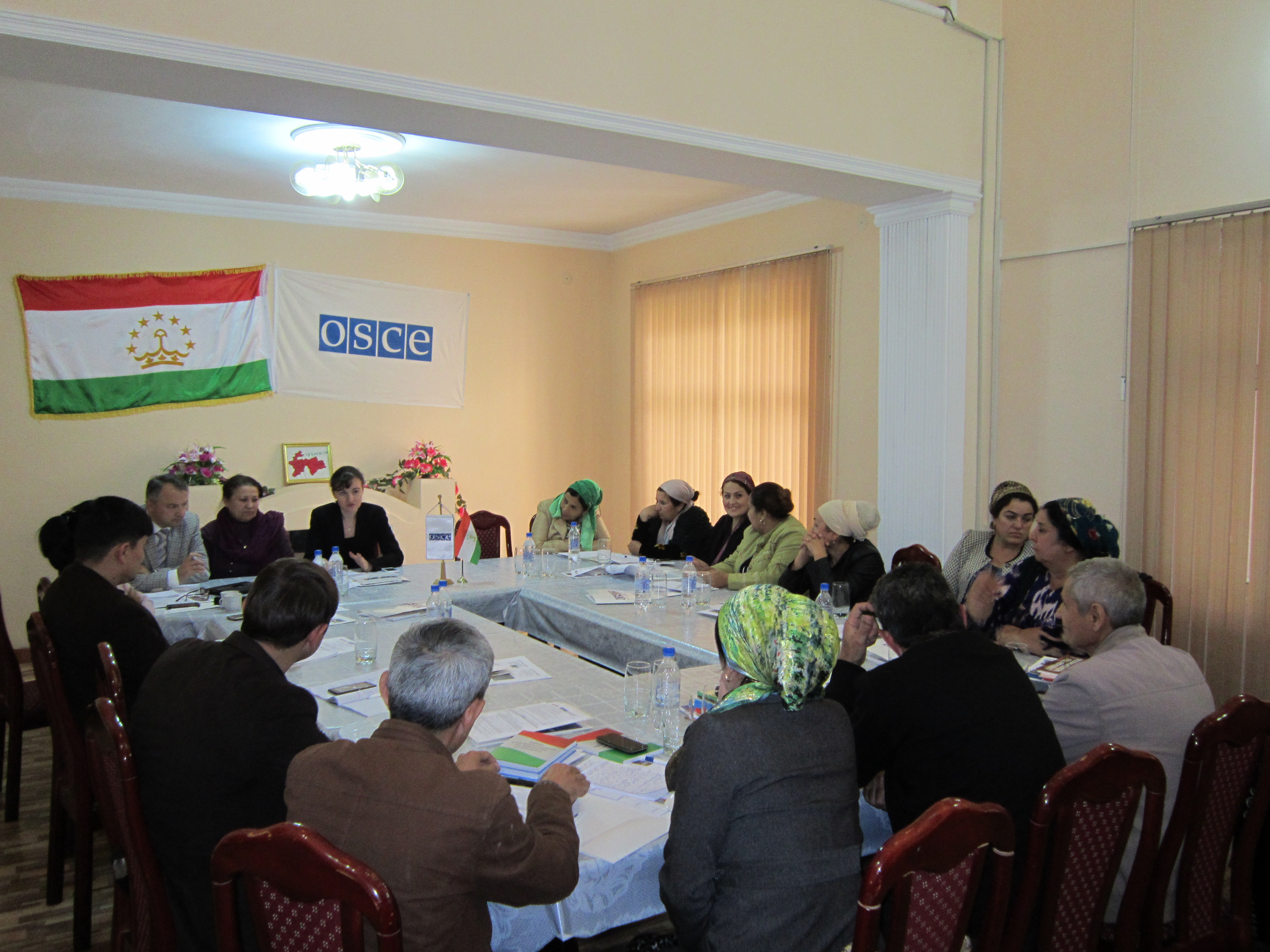 Participants during a one-day workshop for officials and members of civil society on practical referral mechanisms for protection of domestic violence survivors, Kurgan-Tyube, 25 October 2016.