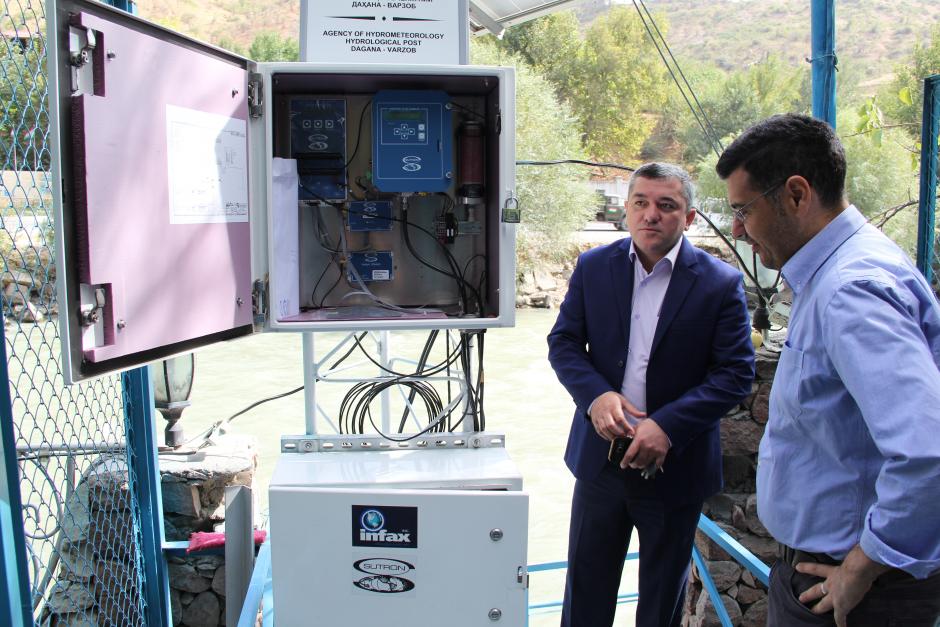 An expert explains the work of the Dagana hydrological post on the Varzob river. This is one of more than ninety such posts along the river that provide data on river flows. This information is key in determining the risk of flooding and for risk reduction management, Varzob, 5 October 2016.