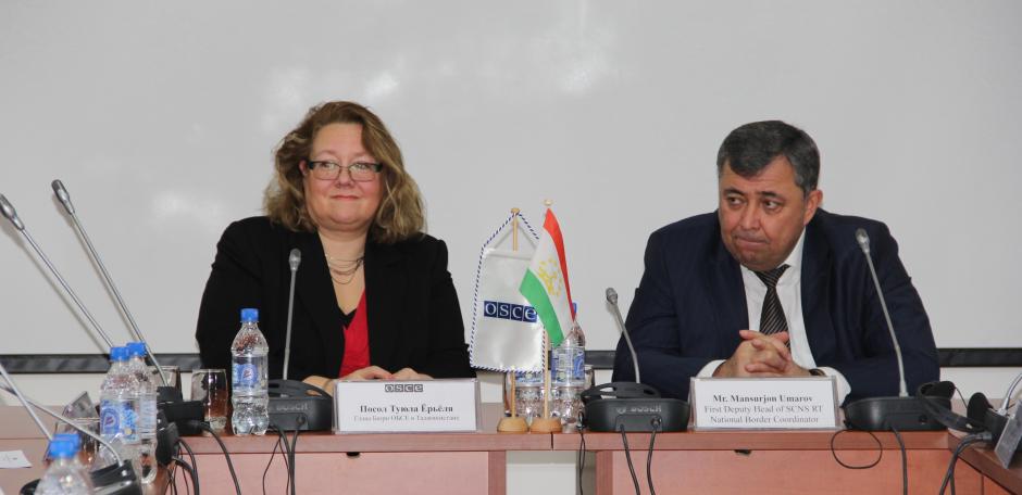 Ambassador Tuula Yrjölä, Head of the OSCE Office in Tajikistan (l) and Mansurjon Umarov, the first Deputy Head of State Committee for National Security and National Border Coordinator (r), speaking at a donation ceremony, Dushanbe, 27 December 2016.