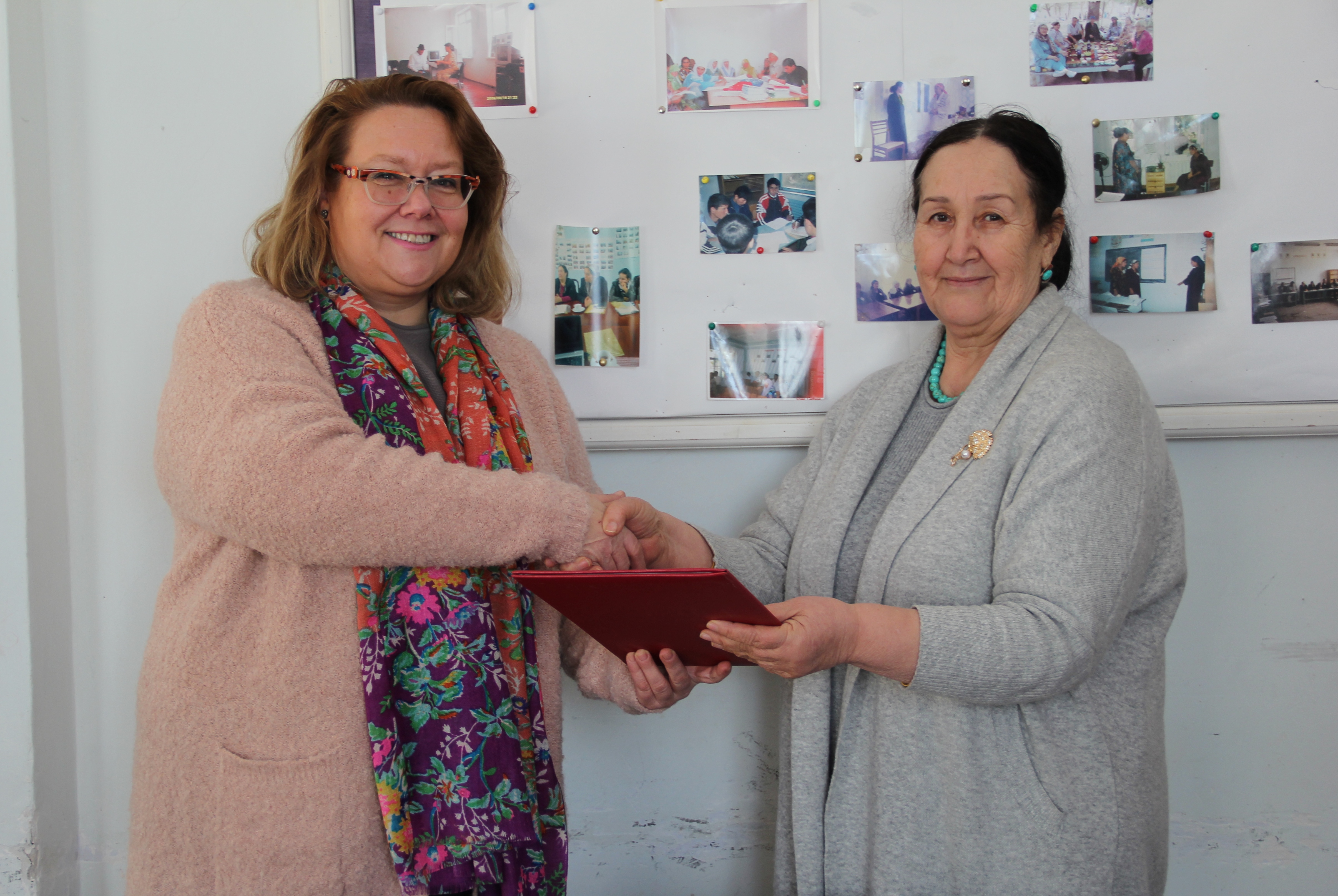 Tuula Yrjölä, Head of the OSCE Office in Tajikistan (l) and Muazama Usmanova, the Director of the Oxana NGO, signing a new implementing partner agreement, Balkhi district, Khatlon region, 3 March 2017.