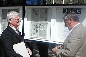 Ambassador Gilbert, Head of the OSCE Centre in Dushanbe (left) officially opens public information boards aimed at improving