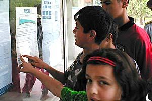 In front of the theatre, people read about the OSCE and its activities in Tajikistan during a tour of human rights films, May 2003.