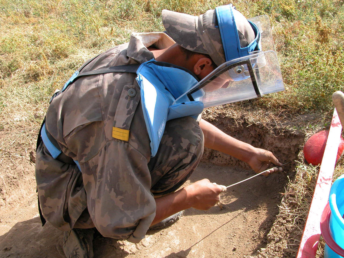 A de-mining trainee in Tajikistan, the site of the OSCE's first mine action project. The excavation method, prodding every inch, is the slowest but safest method.