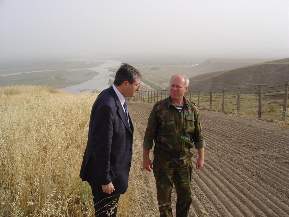 Head of the OSCE Centre in Dushanbe, Ambassador Yves Bargain (left), on the Tajik-Afghan border with Colonel Alexei Shabas of the Russian border guards, 24 May 2004.