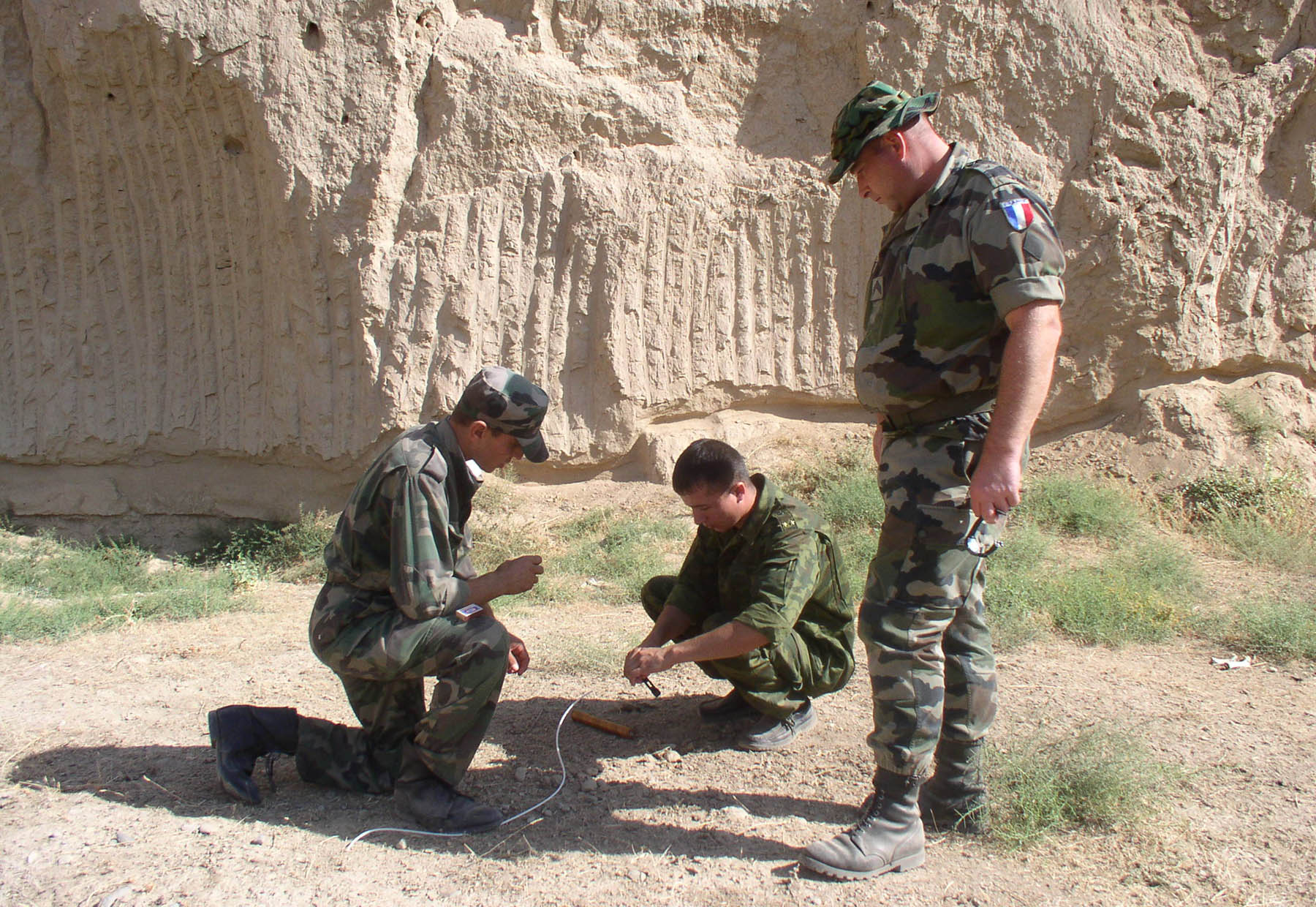 Tajik trainees prepare for their first demolition under the supervision of French explosive ordnance disposal instructor, Staff Sergeant Fabrice Laplagne (right), at an engineer battalion near Lohur, Tajikistan, September 2005.