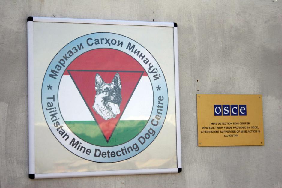 Signs outside a training facility near Dushanbe, April 2006, where dogs will be trained to detect landmines. It was opened with the help of the OSCE Centre in Dushanbe.
