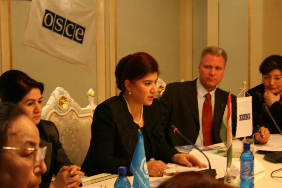 Tajik Deputy Prime Minister Hayrinisso Mavlonova speaks at an OSCE-sponsored forum for women's non-governmental organizations, Dushanbe, 28 November 2006. Acting Head of the OSCE Centre Klaus Rasmussen listens.