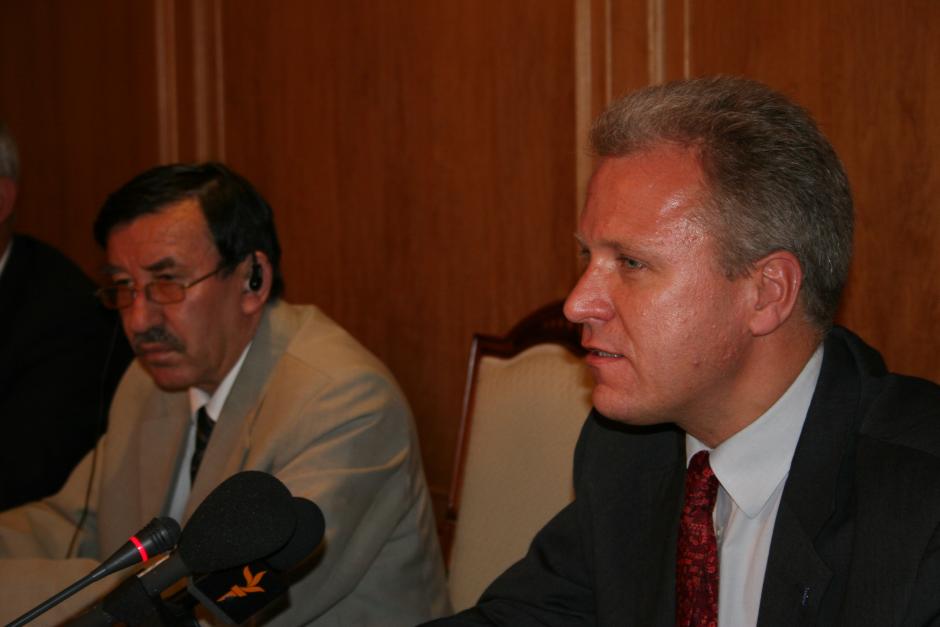 Klaus Rasmussen (l), Acting Head of the OSCE Centre in Dushanbe, speaks to Tajikistan's Public Council about the 10th anniversary of the Tajik peace agreement, as Karomatullo Olimov, Presidential Advisor on Social Development and PR, listens, 8 June 2007.