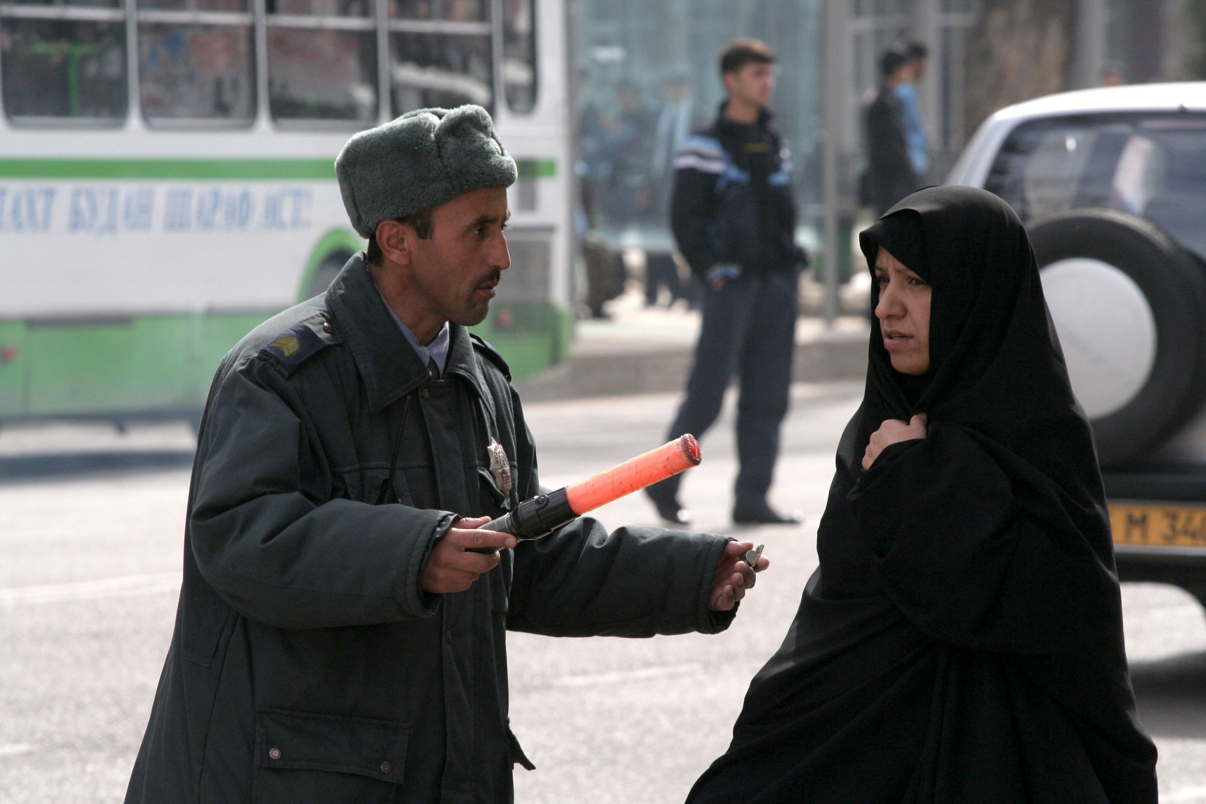 A Tajik traffic policemen speaks with a woman in the street in Dushanbe, in 2006.